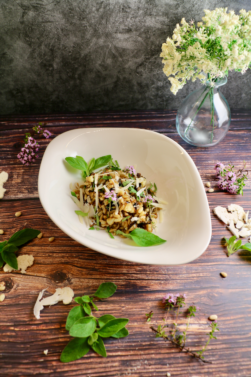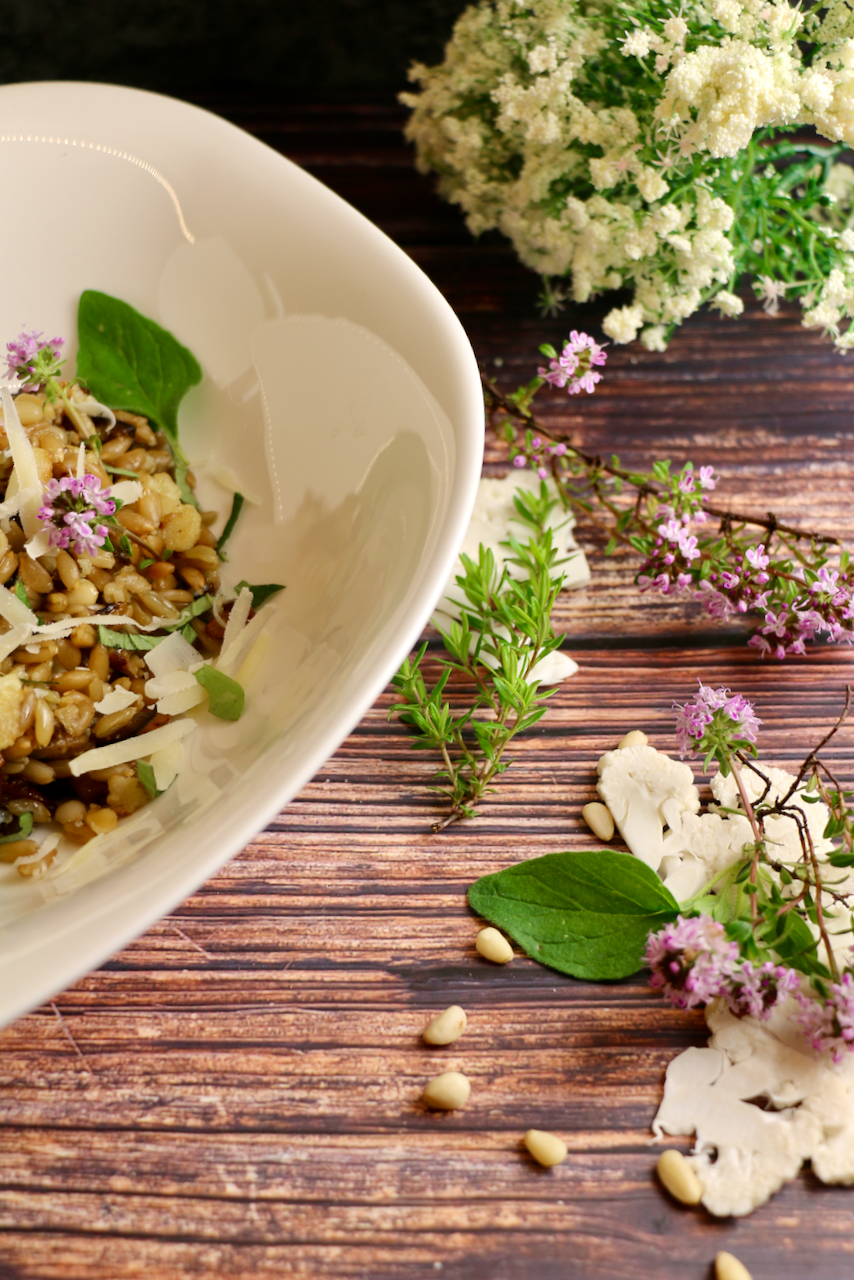 Die weichen Auberginen machen das Grünkernrisotto erst richtig cremig. Der knusprige Karfiol, der Thymian und der Parmesan liefern die Würze.