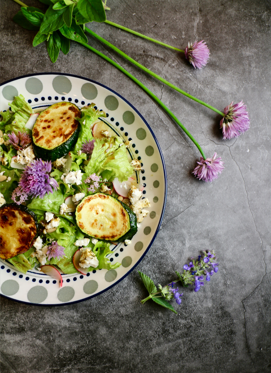 Knackiger Salat mit gebratenen Zucchini und würzig-cremigen Pesto mit Feta.
