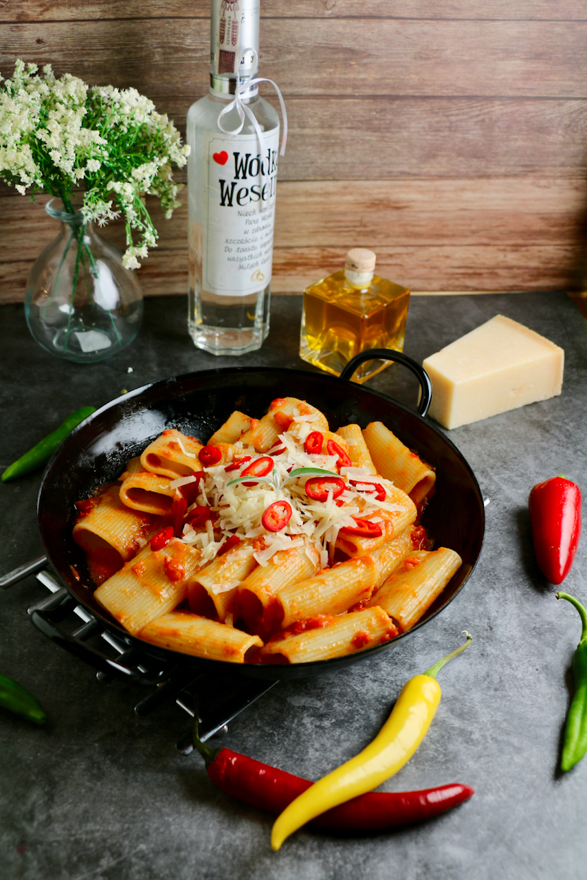 Wir haben für das Gericht original polnischen Wodka verwendet. In Polen wurde der Wodka erfunden und dort bekommt man auch heute noch die beste Qualität. Aber die Sauce schmeckt auch sehr gut ohne, falls ihr keinen Alkohol mögt.