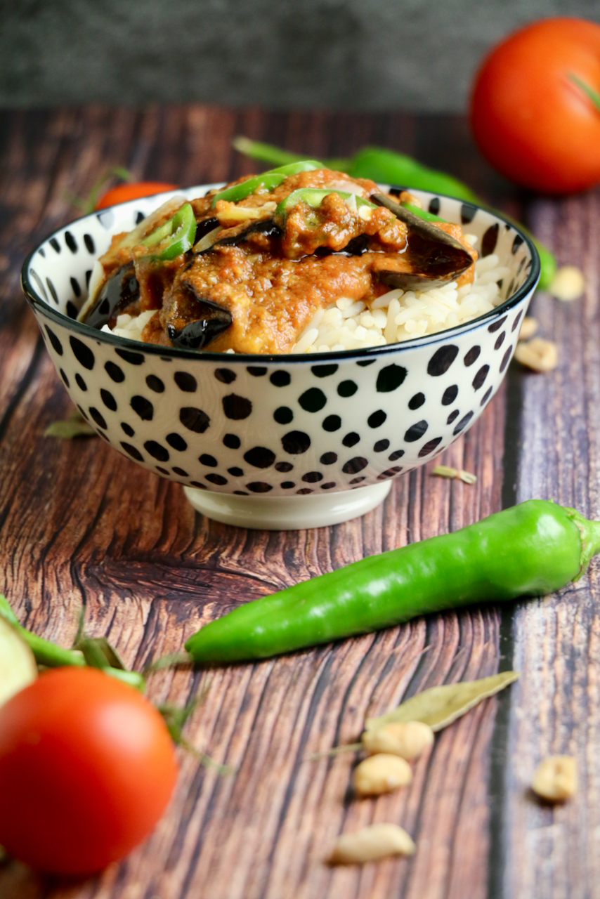 Dieses Gericht mit asiatischer Note ist mit Ingwer, Kreuzkümmel, Knoblauch und Chilis. Dazu kommen noch Erdnüsse und würzige Sojasoße. Das Ganze in einer cremigen Tomaten-Kokosmilch-Sauce. Wir sind der Ansicht: eine wunderbare Kombination von der man einfach nicht genug bekommen kann.