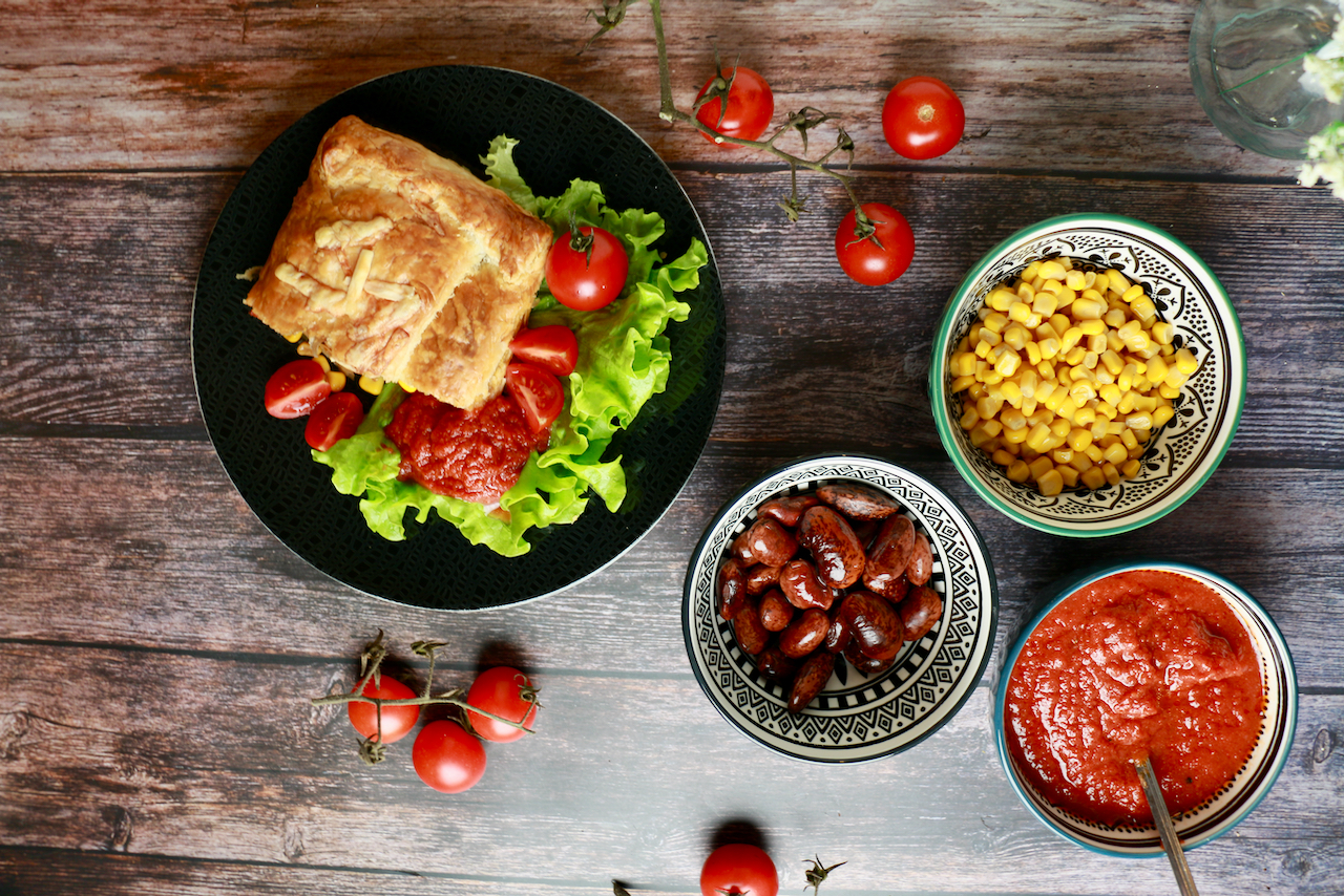 Würziger Blätterteig-Strudel mit viel Zwiebel, Paprika, Käferbohnen und Mais. Ein schnelles und einfaches, vegetarisches Gericht, das immer gut bei Parties ankommt.