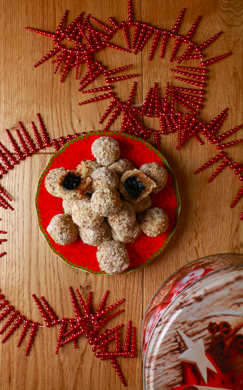 - Dotter mit etwas Wasser verrühren und die Kugeln darin wälzen. Danach gleich in ein tiefes Teller mit den geriebenen Mandeln geben und panieren.