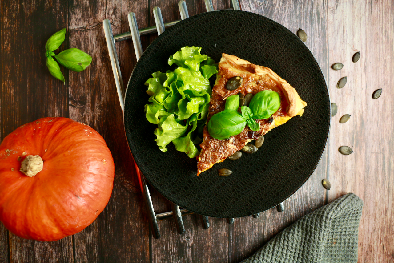 Koriandersamen und Knoblauch passen wunderbar zu Kürbis. Alles zusammen kommt in diese würzige Winter Quiche.