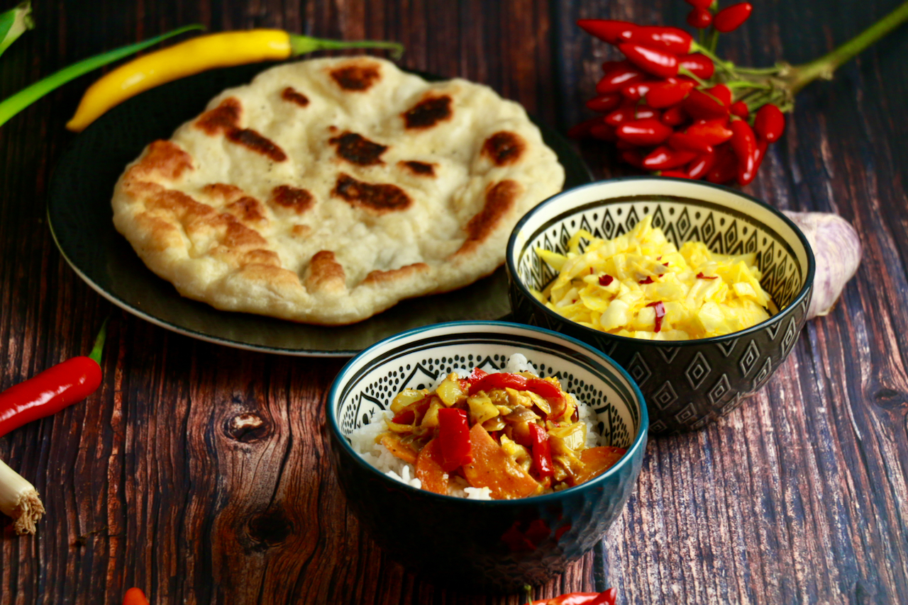 Wir lieben dazu den süß-scharfen Krautsalat mit Curry und Chilis. Und unser selbstgemachtes Naan-Brot.