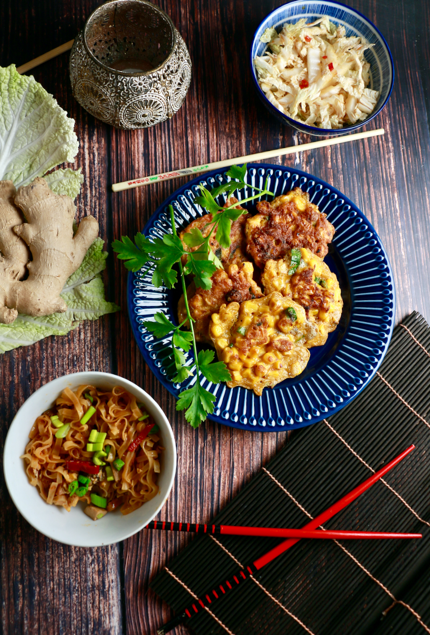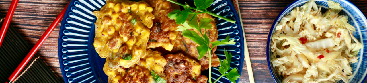 - 1.Die Eier versprudeln und mit der Currypaste oder dem Currypulver und der Sojasauce vermischen. Mit dem Mehl, den in feine Ringe geschnittenen Frühlingszwiebeln (samt grünen Teil) und der gehackten Chili vermischen und evtl. mit Salz nachwürzen. Maiskörner unterheben.