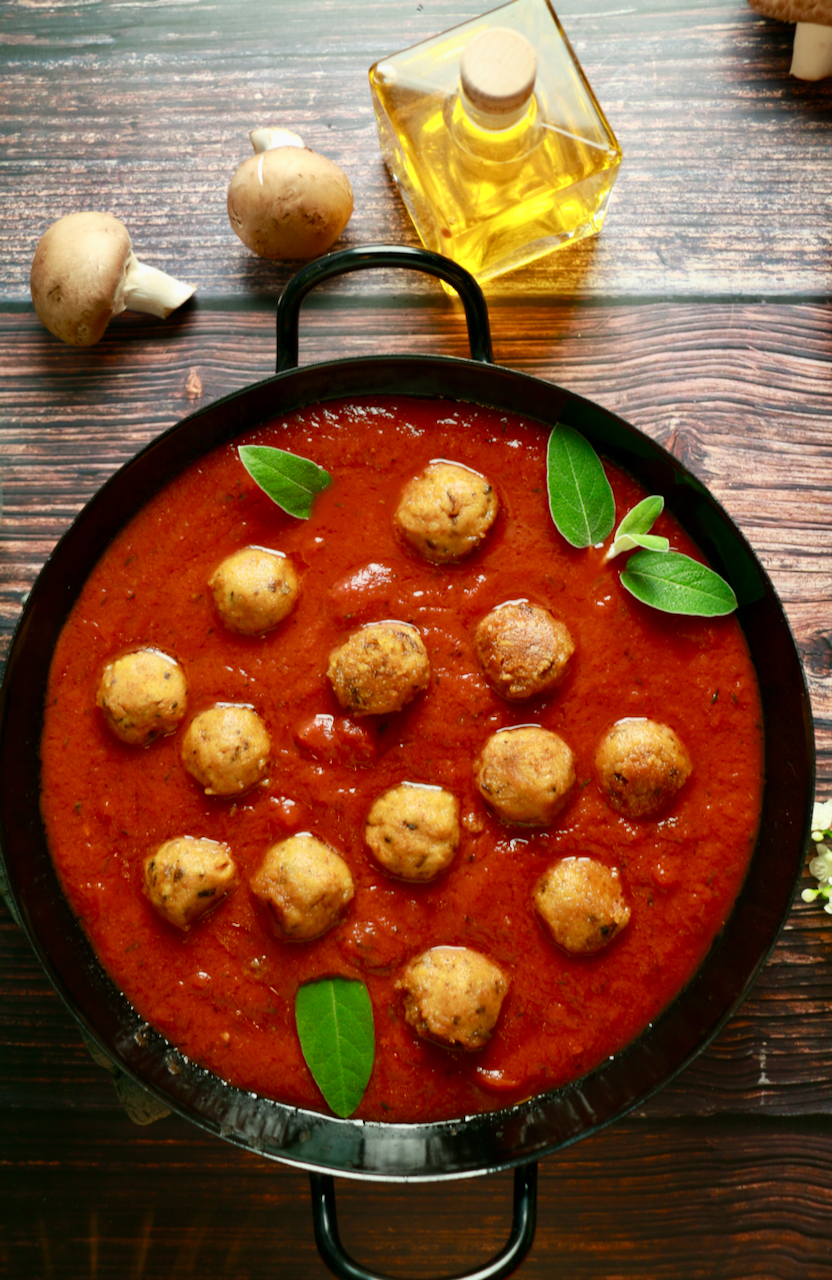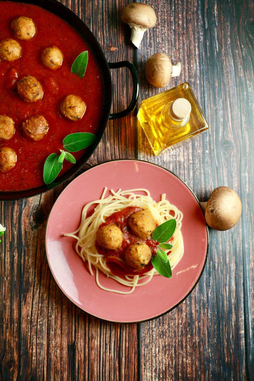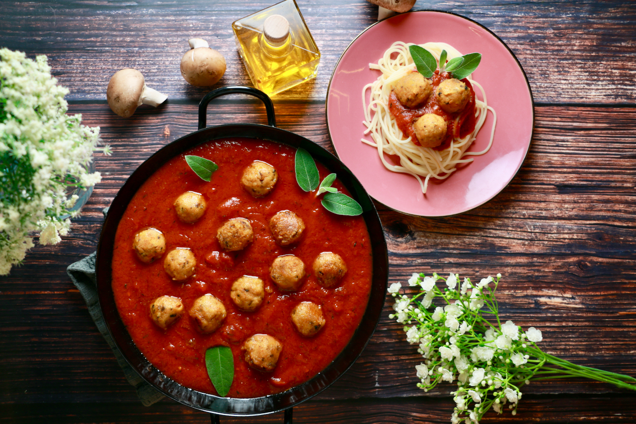 Meatballs mit Spaghetti und Tomatensauce sind ein echter Klassiker der amerikanischen Küche. Unsere Meatballs kommen aber ohne Fleisch aus und sind sogar vegan. Durch die vielen aromatischen Schwammerl, die wir vorher goldbraun gebraten haben, stehen sie dem Original an Würze um nichts nach!