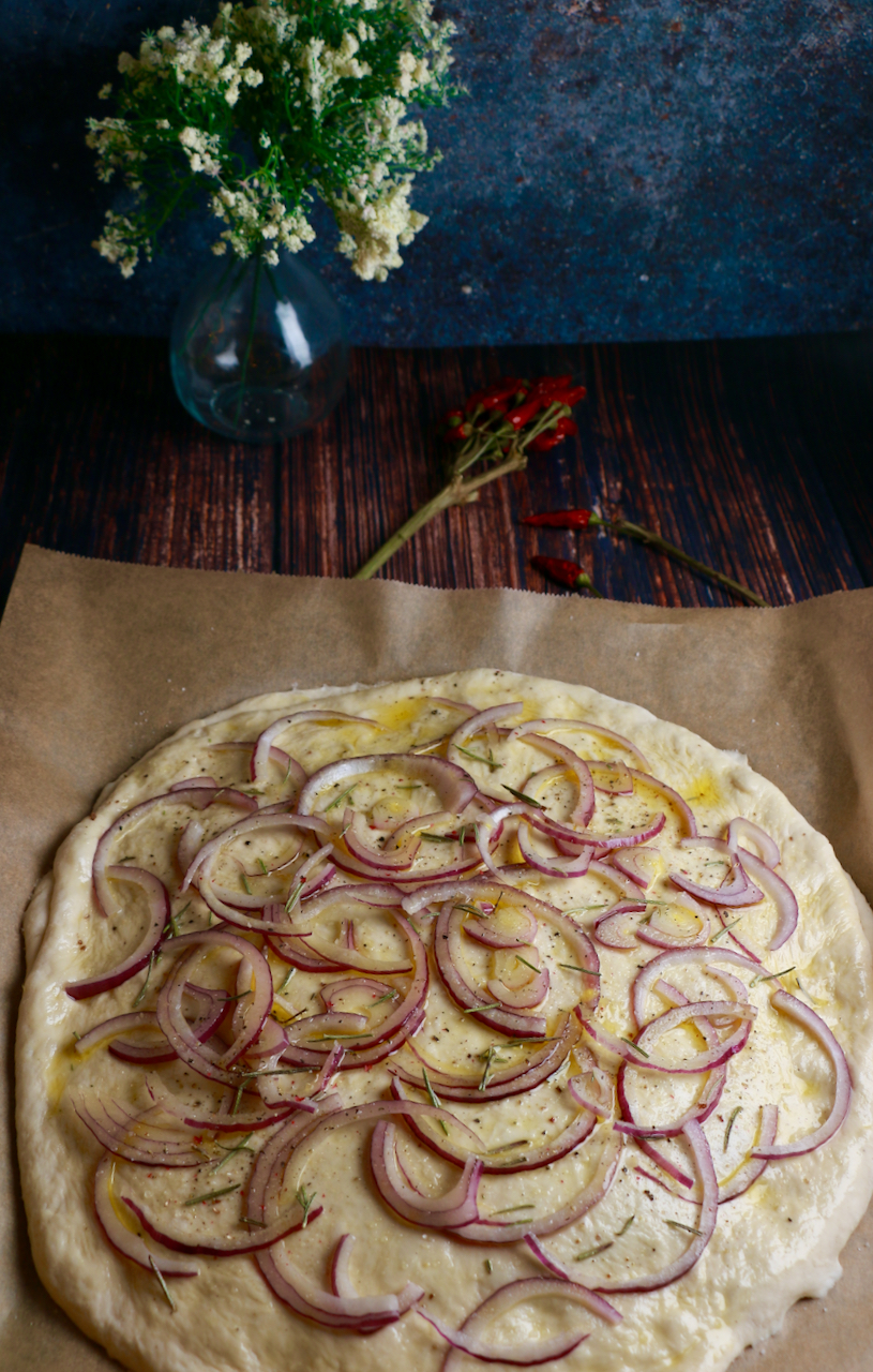 - Zwiebel in feine Scheiben schneiden und die Focaccia belegen. Von den Rosmarinzweigen die Nadeln abzupfen und auch darüber streuen.