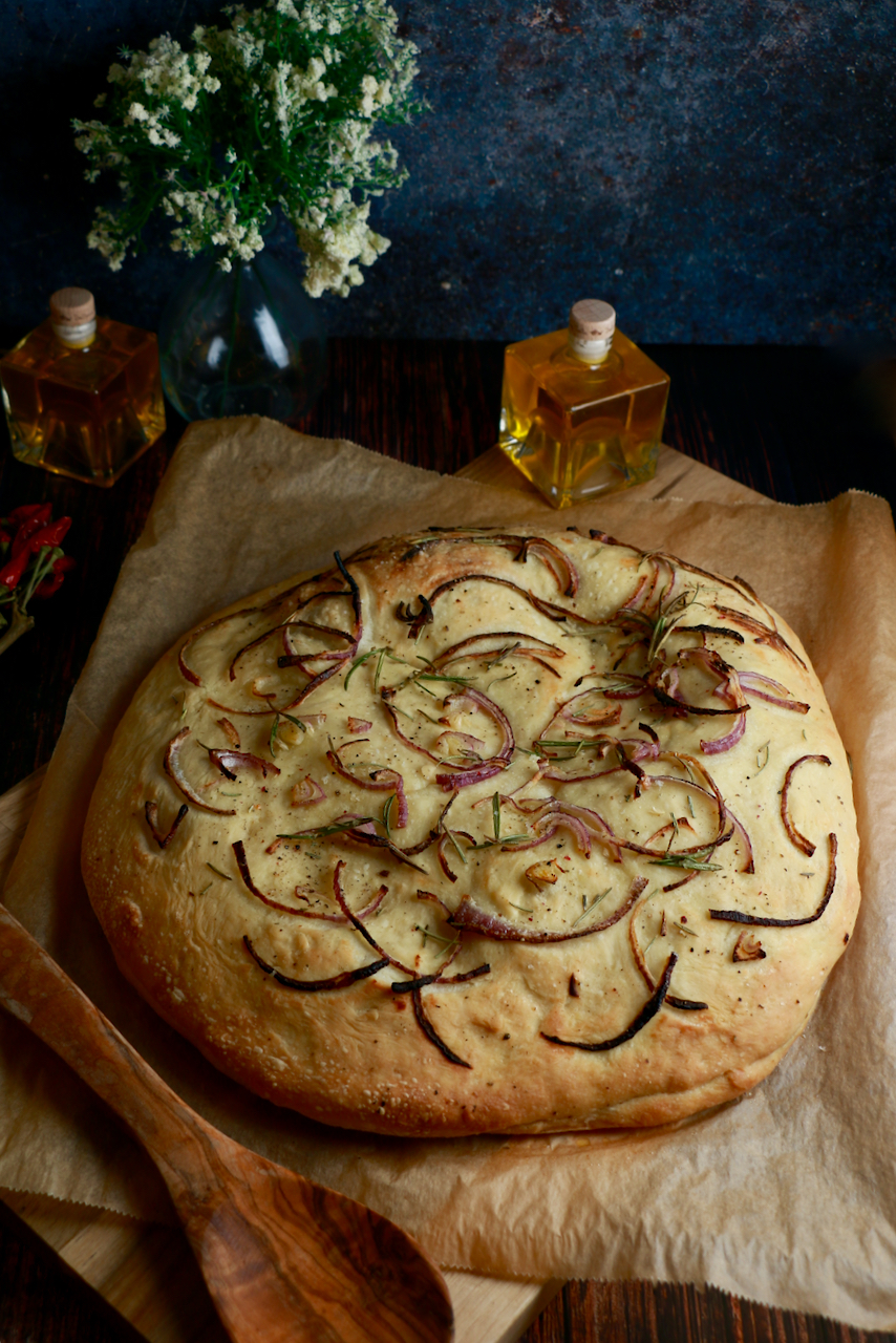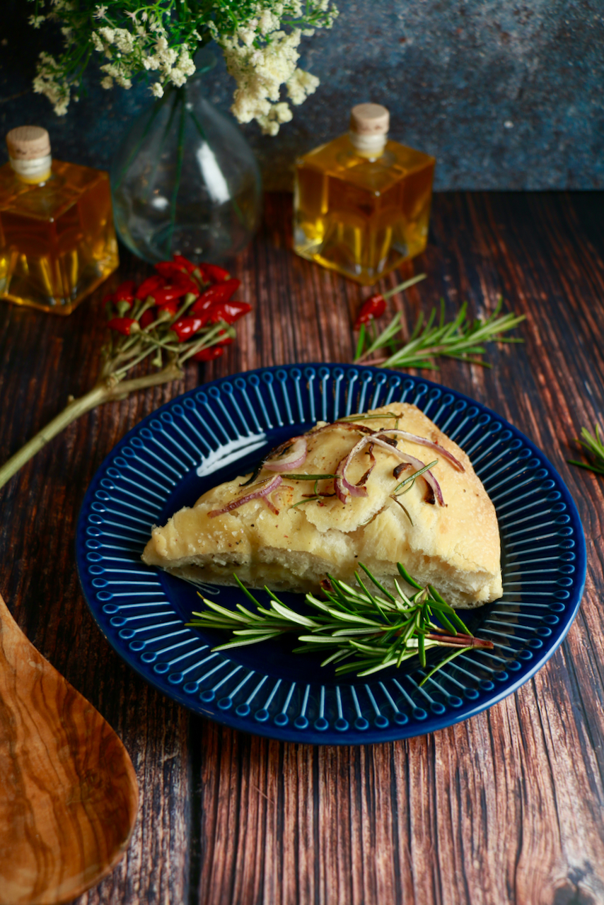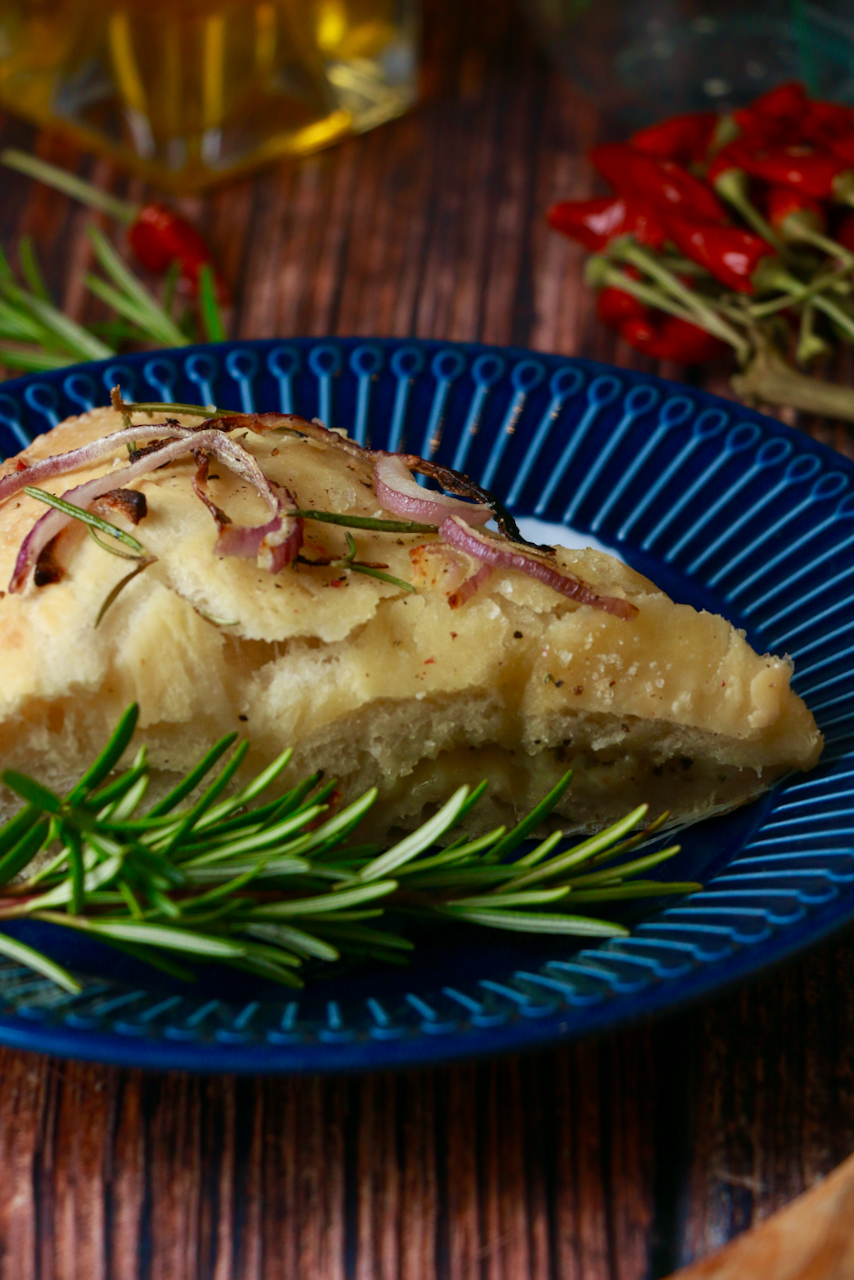 Diese Focaccia, die mit Mozzarella gefüllt wird, wird vor allem in Ligurien, eine Region im Nord-Westen von Italien, gerne gegessen. Schon in der Antike wurde Focaccia als einfaches Fladenbrot mit Olivenöl zubereitet. Heute wird das klassische Focaccia mit allerlei Toppings verfeinert, wie zum Beispiel Tomaten und Oliven. Aber auch Kapern oder Knoblauch sind beliebt. Wir haben uns für rote Zwiebel und Rosmarin entschieden.