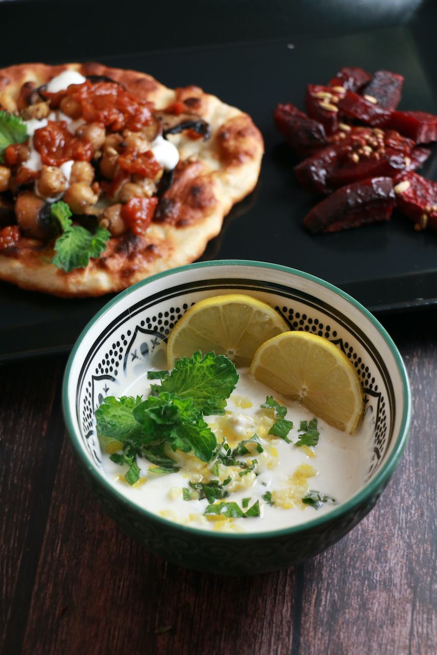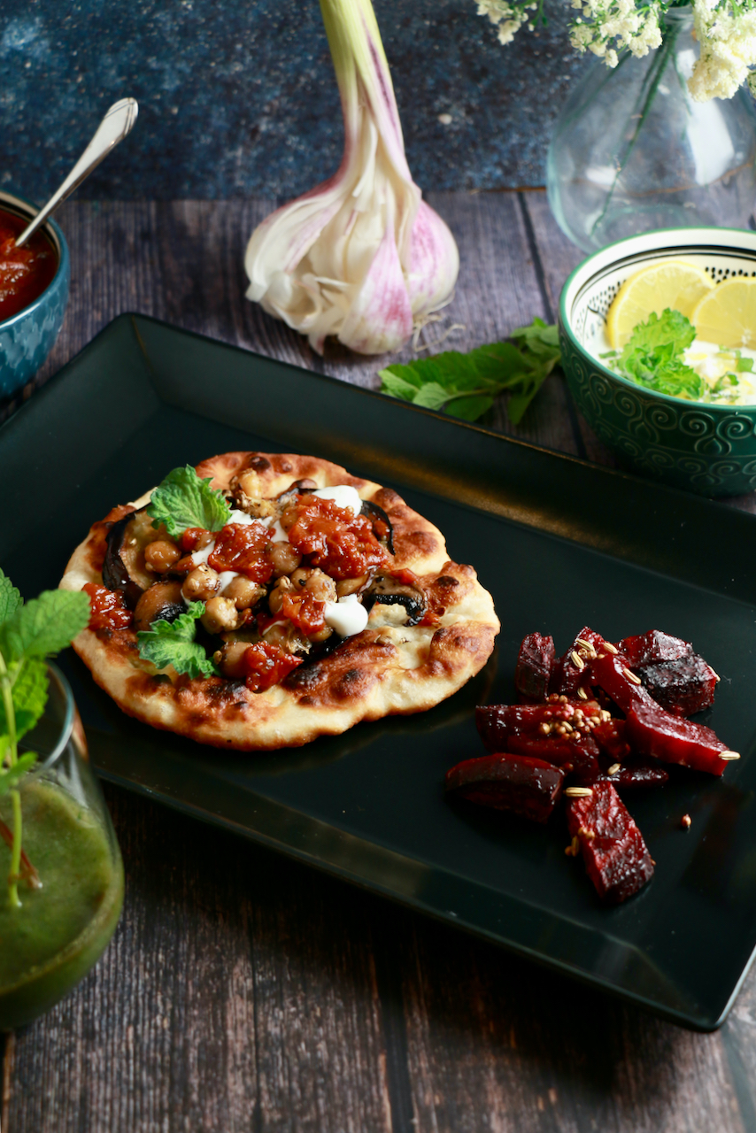 Für das Fladenbrot verwenden wir immer Joghurt. Das gibt dem Brot eine besondere säuerlich-aromatische Note. Darauf kommt gegrilltes Gemüse, wie Auberginen und Pilze. Dazu zwei verschiedene orientalische Saucen: ein süß-scharfes Tomaten-Chutney und ein erfrischendes Zitronen-Minz-Joghurt.