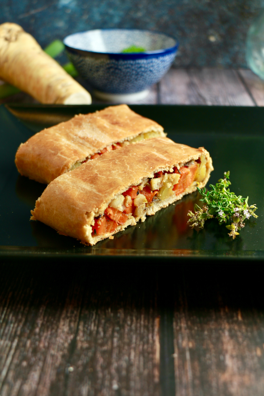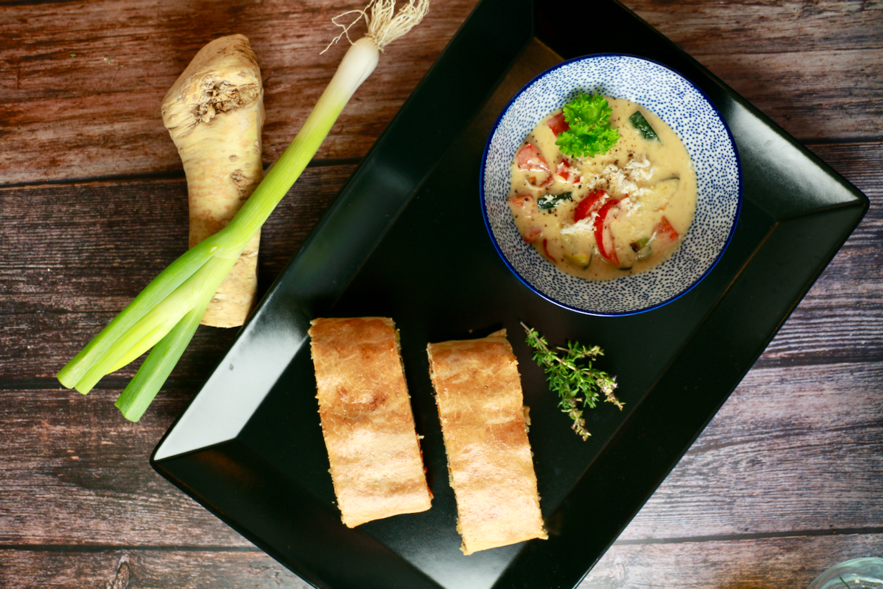 Bei uns gibt es heute einen klassischen Erdäpfel-Karotten-Strudel mit Kren-Paprika-Sauce.