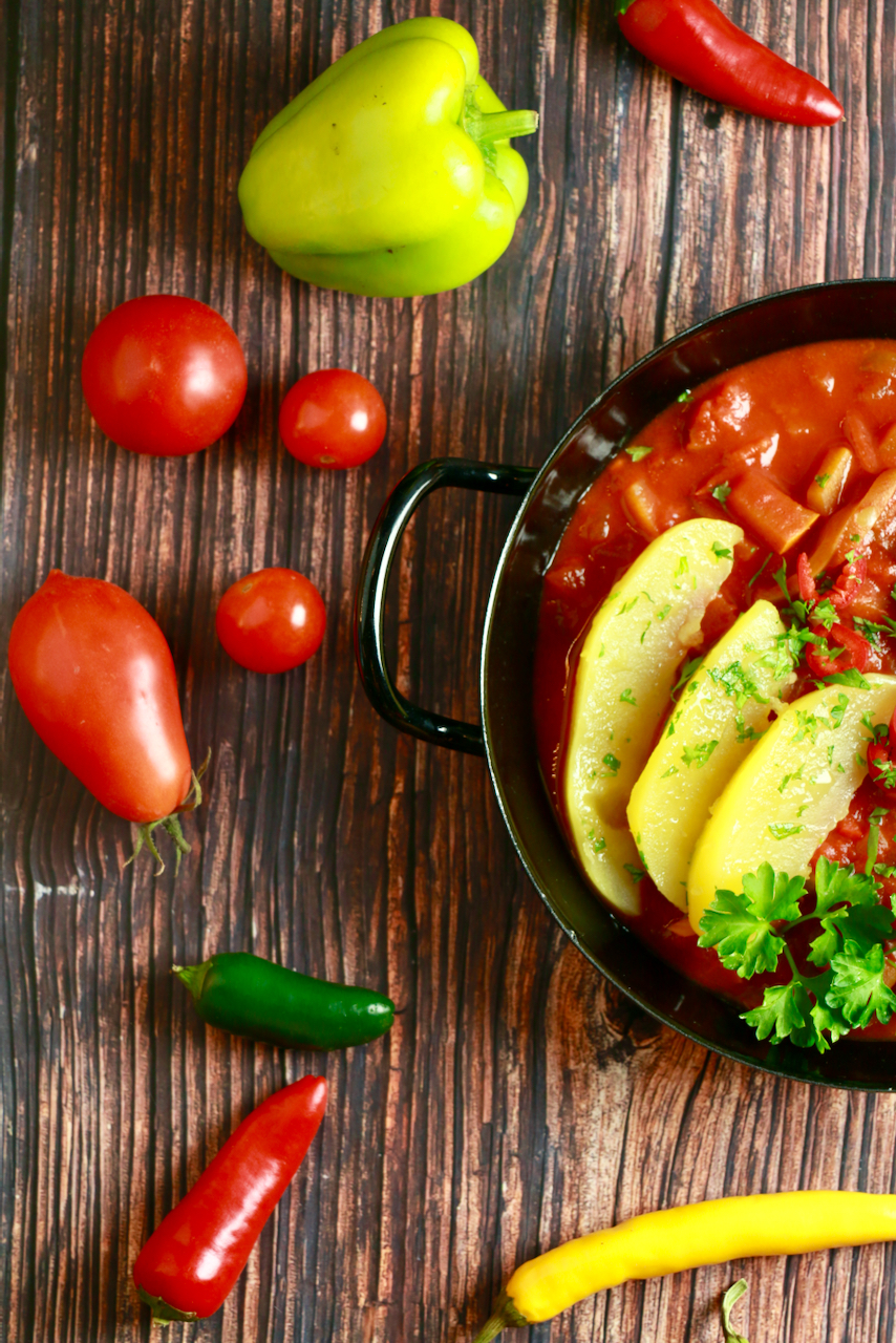 Unser Gulasch ist herzhaft und feurig – und natürlich ganz ohne Fleisch. Unsere vegetarischen Gerichte kommen auch immer ohne industrielle Ersatzprodukte für Fleisch aus und schmecken trotzdem spitze. Wir verwenden nur frisches, knackiges Gemüse und viele Gewürze. Zum Gulasch passen am besten Salzkartoffeln mit Petersilie und Butter.