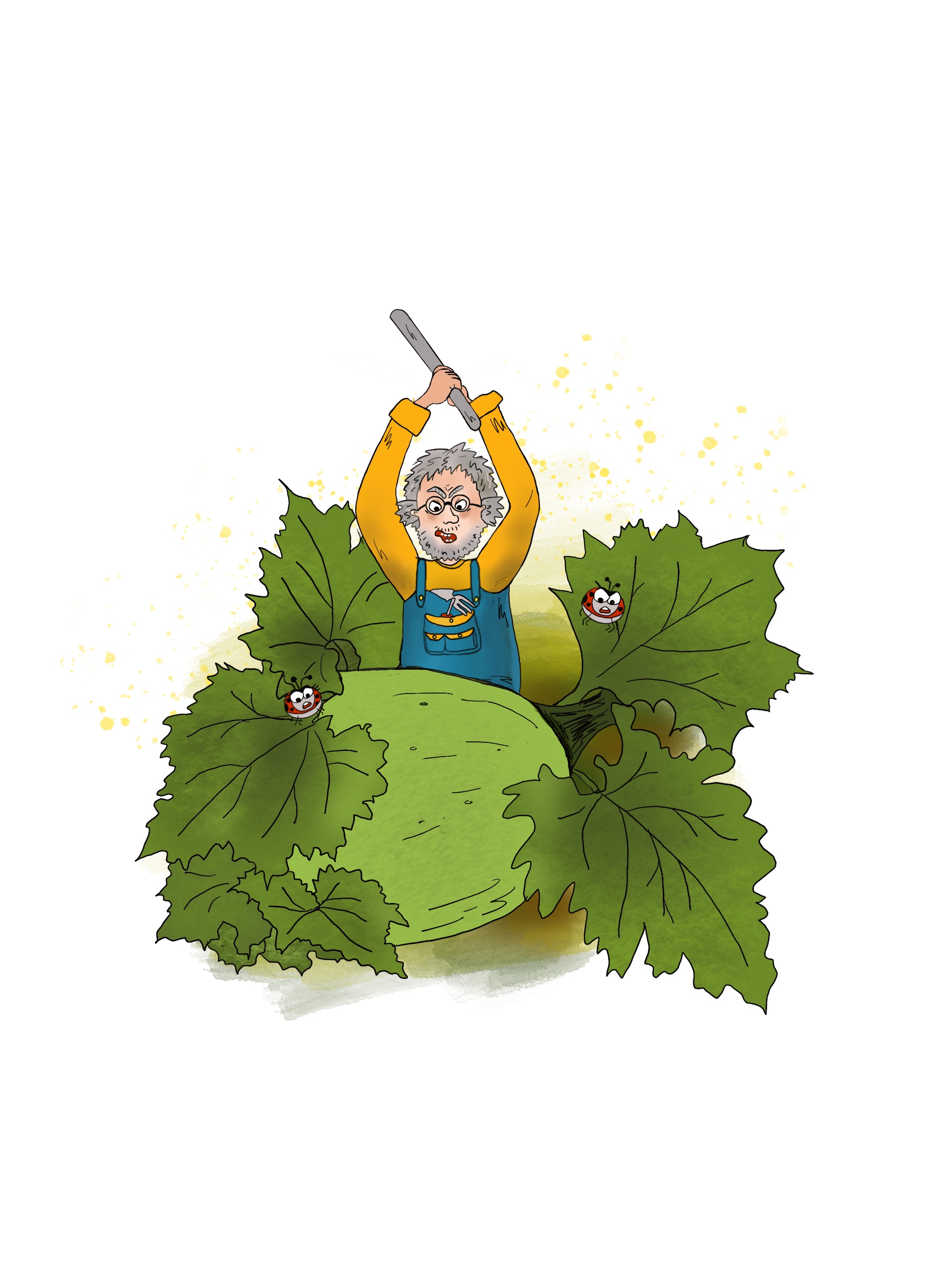 Tipps aus ‚Franz im Gartenchaos‘: Zucchini schmecken am besten gegrillt. Und gedünstet. Und gefüllt. Und als Creme-Suppe. Und frisch zusammen mit Karotten in Stiftchen geschnitten als Salat. Und sogar als Torte! Das Wichtigste ist, dass du sie erntest, bevor sie zu groß werden. Sonst sind sie innen schwammig, haben harte Kerne und lassen dein Haus einstürzen.‘