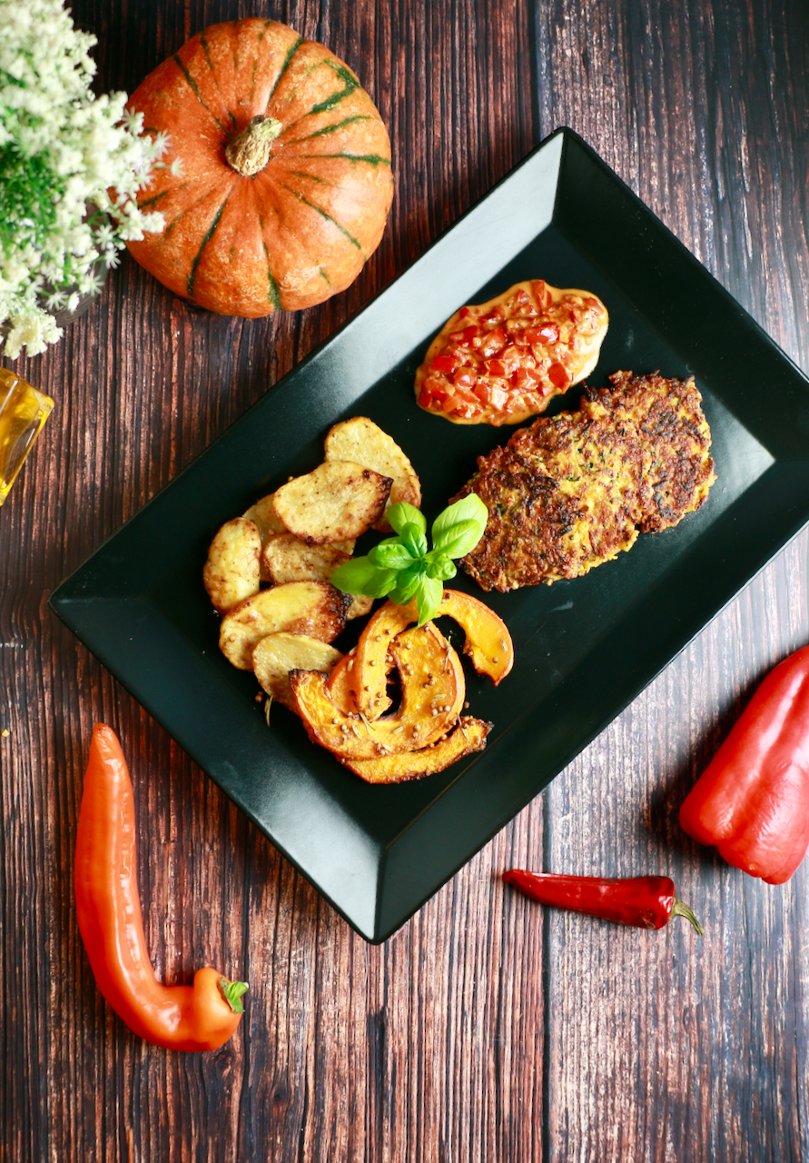 Die knusprigen Laibchen mit Zucchini und Karotten und einer würzig-feurigen Sauce und süßem Kürbis mit viel Koriander und Fenchelsamen sind einfach zuzubereiten und schmecken köstlich. Ein herrliches, vegetarisches Sonntagsessen oder auch perfekt für Gäste.