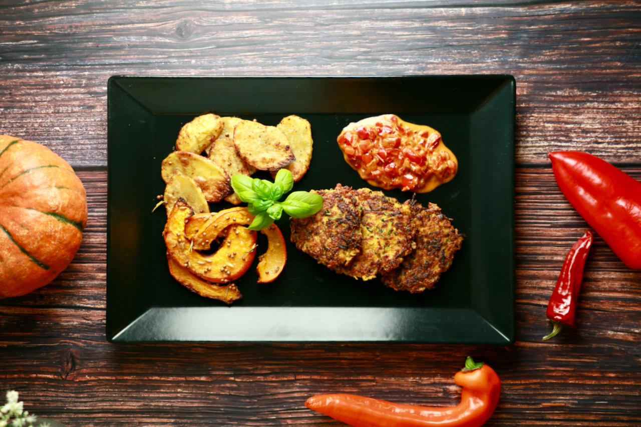 Knusprige Zucchini-Parmesan-Laibchen mit einer würzig-feurigen Sauce und süßem Kürbis