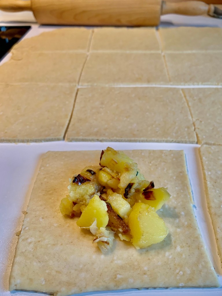 - Jeweils 2 Esslöffel Fülle auf jedes Teig-Quadrat setzen und zu Golatschen zusammenschlagen.