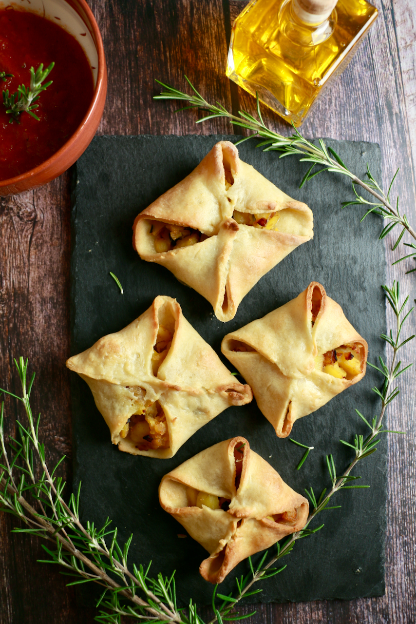 Die pikanten viereckigen Teigtaschen sind mit knusprig gebratenen Kartoffeln und Zwiebeln gefüllt. Dazu gibt es eine würzige Tomatensauce mit aromatischem Rosmarin. Ein herrliches und unkompliziertes Rezept für alle, die Erdäpfel genauso lieben wie wir.