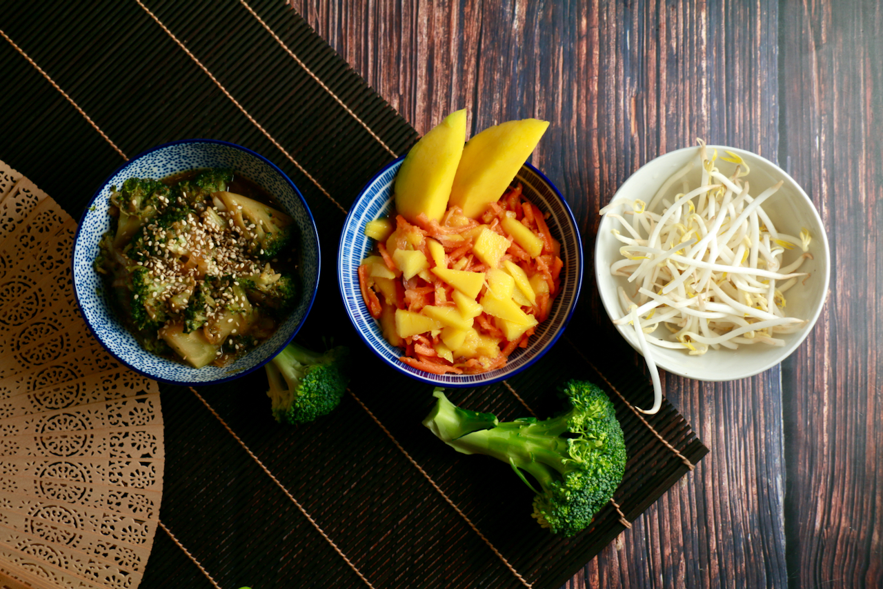 Ein ungewöhnlicher Salat aus Zwiebeln, Karotten und fruchtig-süßen Mangos. Einfach genial! Er schmeckt hervorragend vor allem zu würzigem Brokkoli mit viel Knoblauch und Sojasauce.