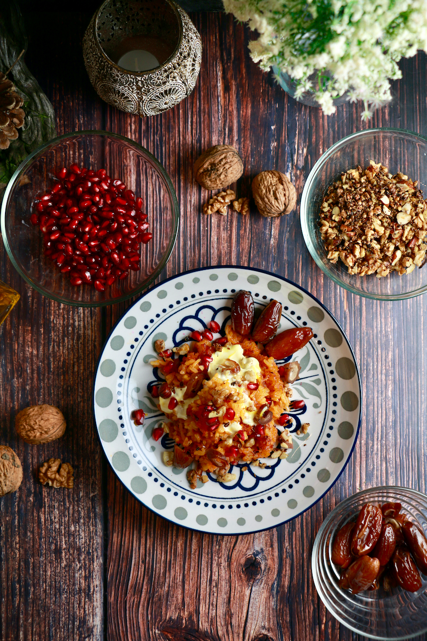 Roter Safran-Reis – wir finden, ein phantastisches Gericht! Sehr intensiv durch die getrockneten Tomaten und den Safran. Die selbstgemachte Gewürzmischung Dukkah liefert eine extra Portion Geschmackskick. Mit einem Klecks Joghurt oben drauf, schmeckt es außerdem noch herrlich frisch. Und die süßen Datteln und die säuerlichen Granatapfelkerne machen das Gericht erst so richtig spannend.