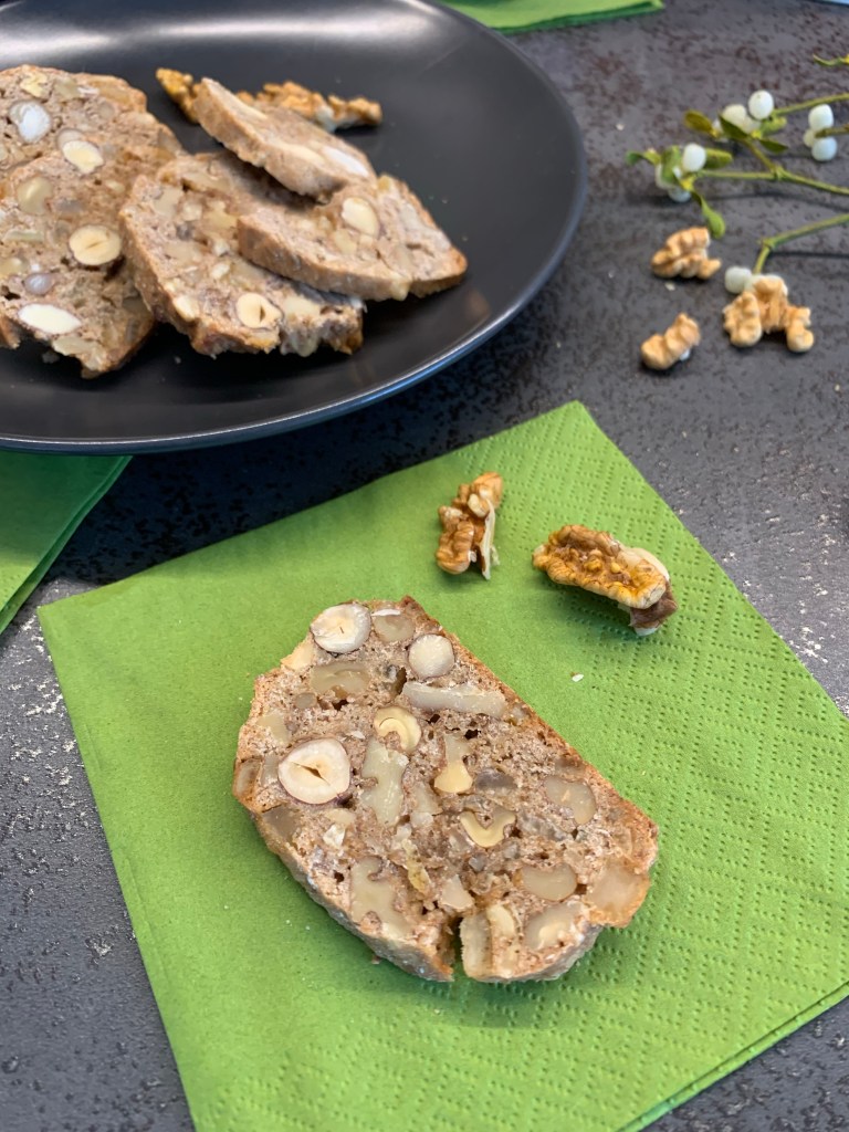 Selbst gemachter Zwieback mit Walnüssen und kandierten Orangen.