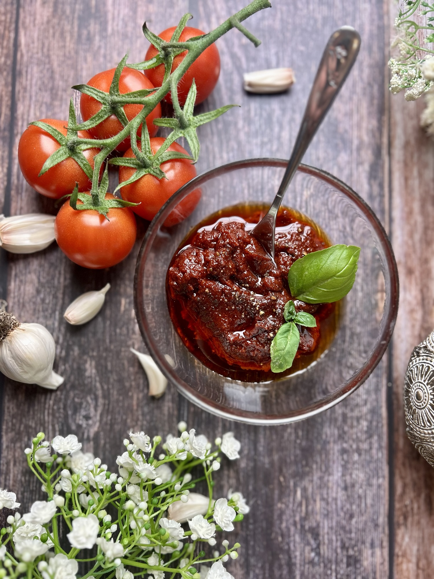 - Rotes Paprikapulver (edelsüß oder geräuchert) und Tomatenmark oder ein frischer süßer roter Paprika
