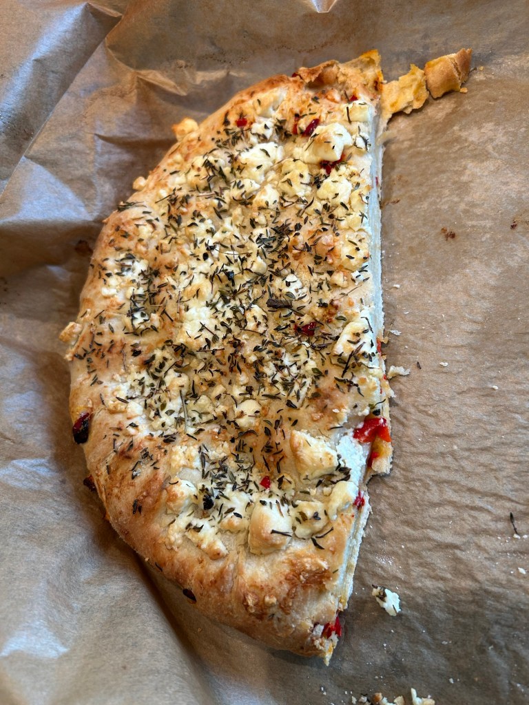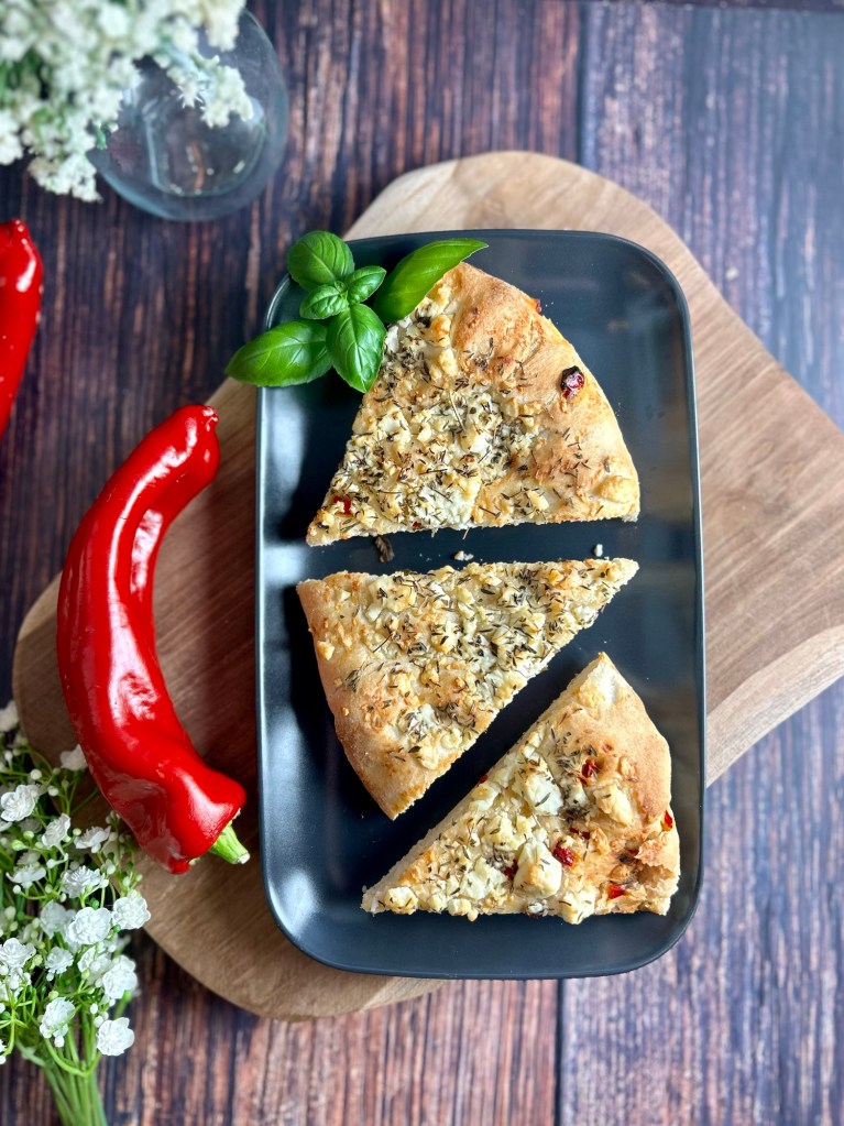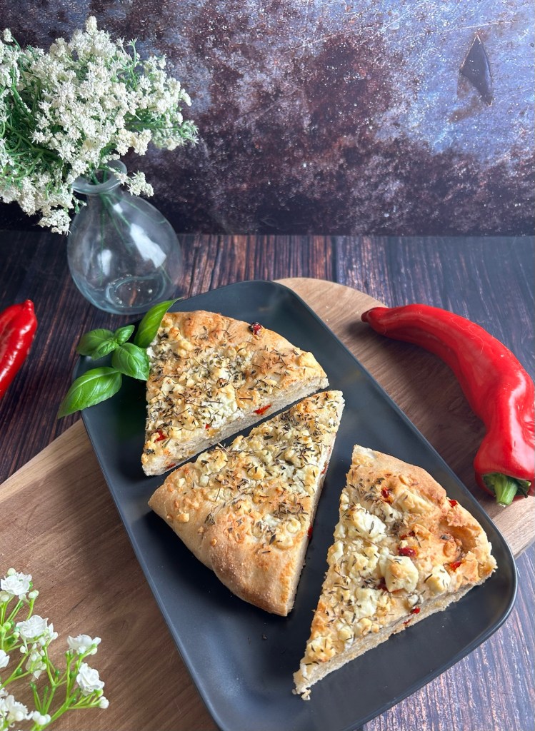 Focaccia kann pur genossen oder mit verschiedenen Zutaten wie Oliven, Tomaten, Zwiebeln oder Käse belegt werden. Es ist ein vielseitiges Brot, das als Vorspeise, Beilage oder sogar als Sandwichbrot serviert werden kann. Bei unserer Variante verwenden wir Paprika und Feta.