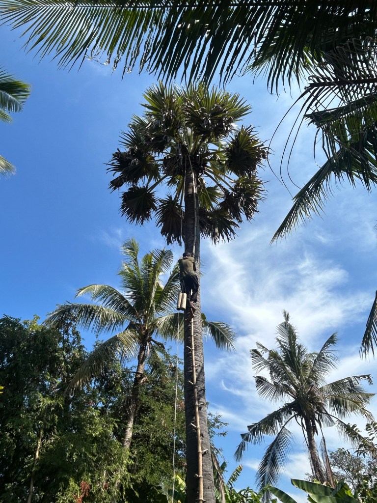 Zuerst wird der Saft aus den Blütenständen der Palme gesammelt. Keine leichte Aufgabe! Dazu schneidet ein Arbeiter die Spitze des Blütenstandes an und hängt einen Behälter darunter, um den tropfenden Saft aufzufangen. Und das in schwindelerregender Höhe!