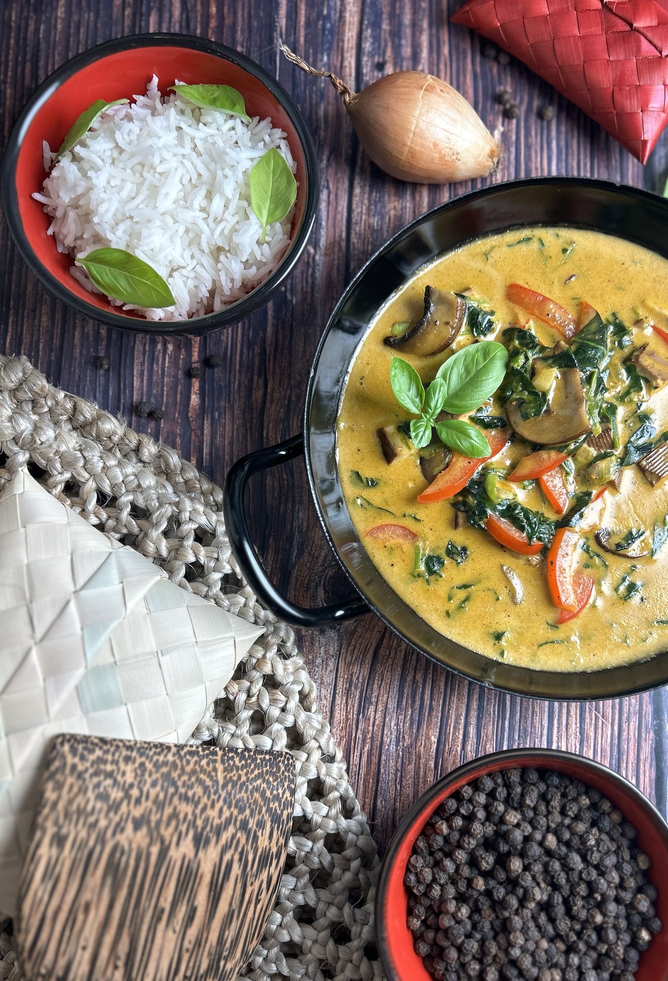 - Kurz vor dem Servieren den Spinat unterrühren. Das vegetarische Amok in Schalen füllen, mit frischem Koriander oder Thai-Basilikum garnieren und heiß mit Jasminreis servieren.