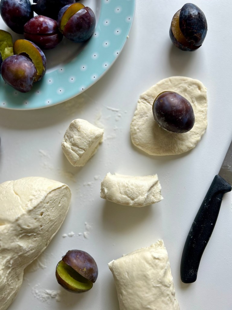 - Den Teig in ca 20 Portionen teilen, flachdrücken und die Zwetschken darin einwickeln. Knödel formen.
