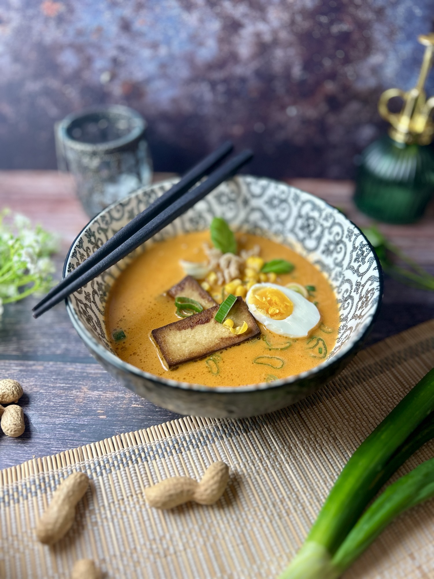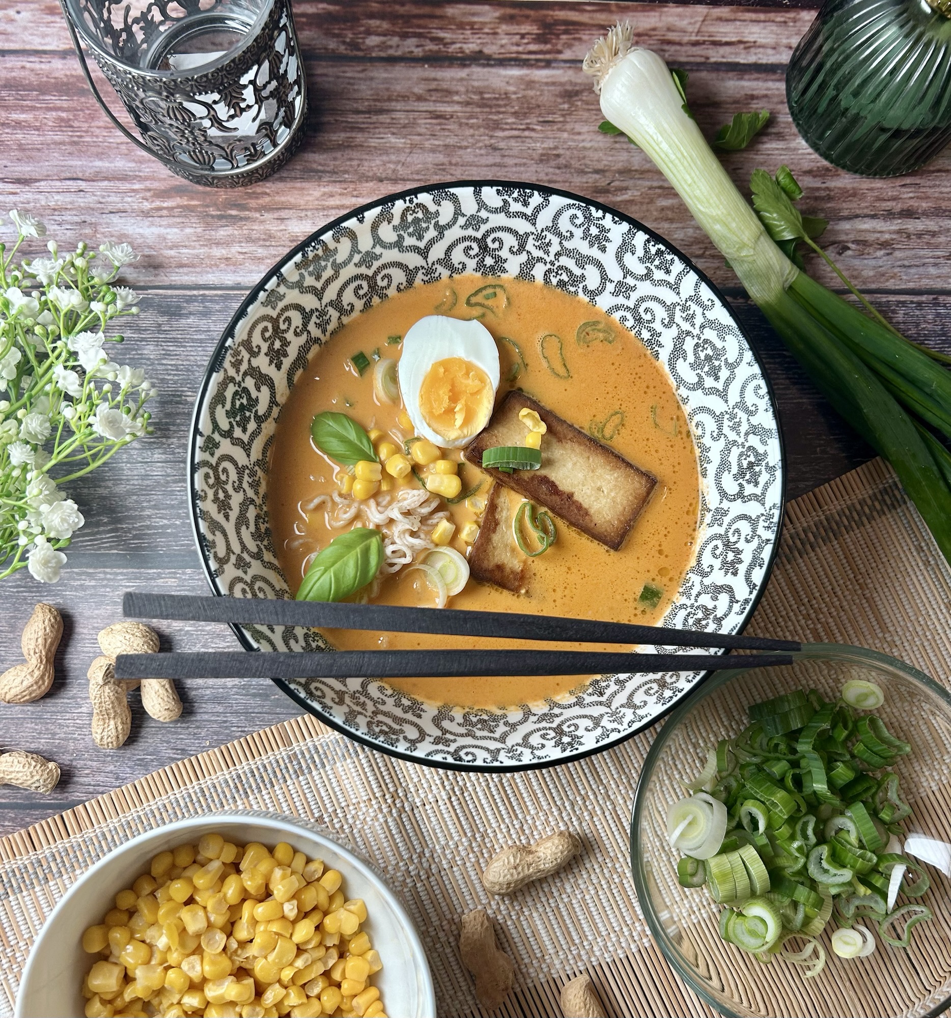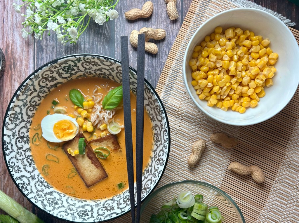 Denn hier treffen hausgemachte Gemüsesuppe, gerösteter Tofu, cremige Kokosmilch und würzige Currypaste auf die herzhaften Umami-Noten von Sojasauce und gerösteten Erdnüssen. Dazu ein weichgekochtes Ei, knackiger Mais und Frühlingszwiebeln – und fertig ist eine Bowl, die satt und glücklich macht.