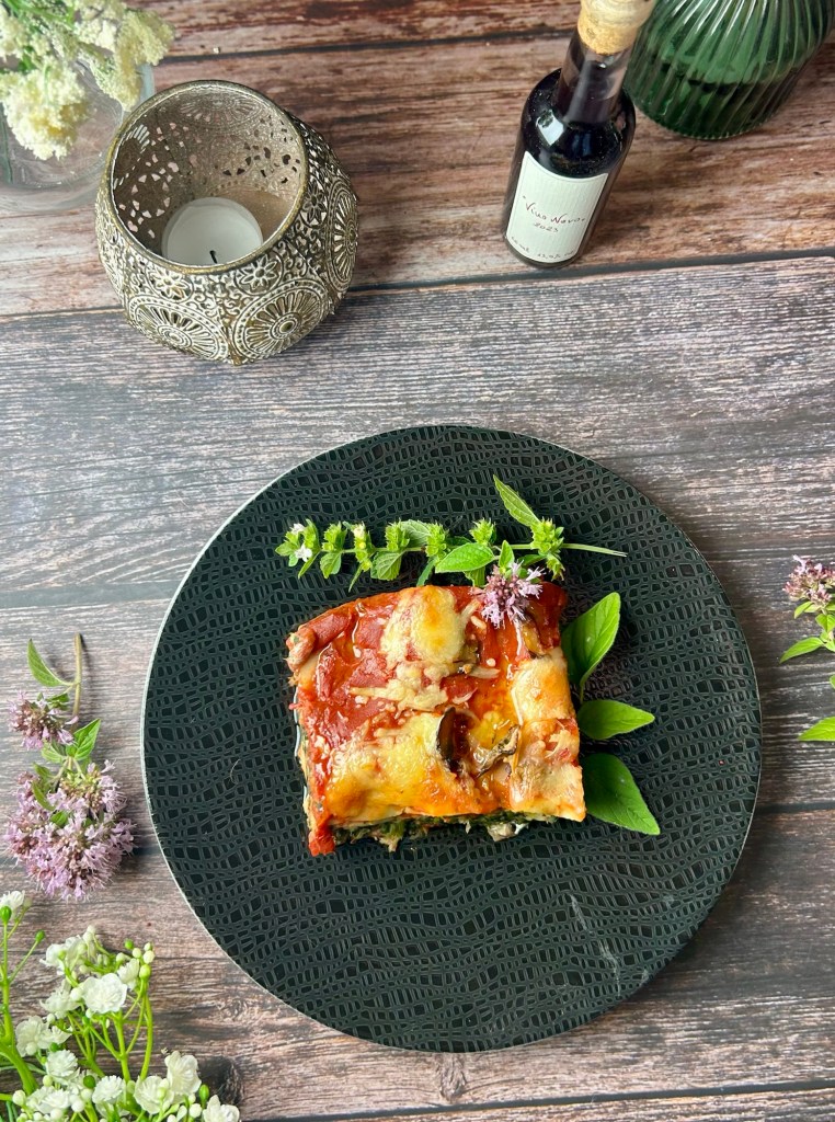 Spinatlasagne mit Champignons und würziger Tomatensauce