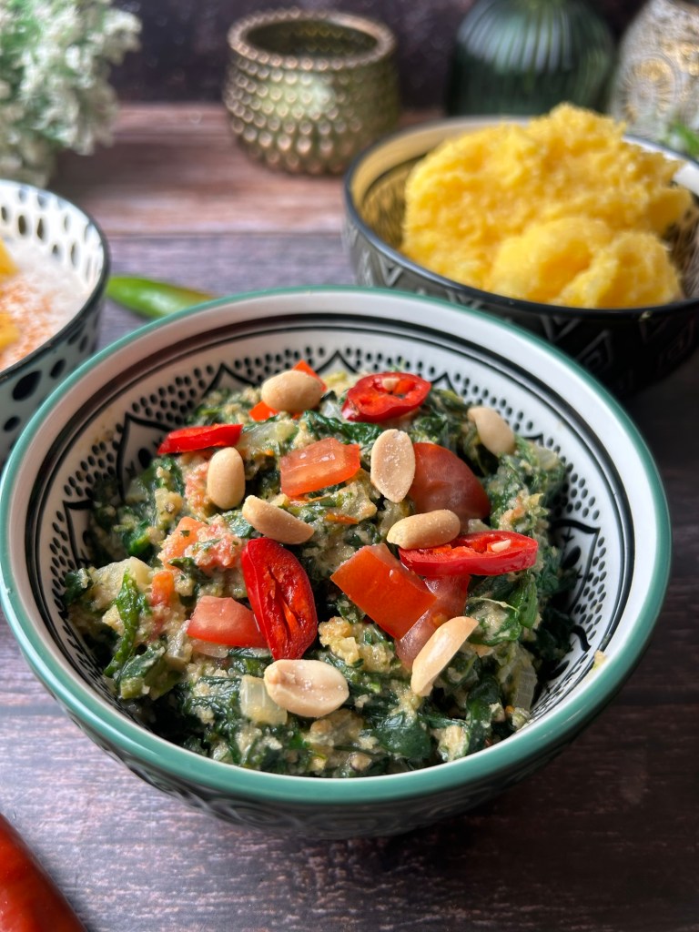 - Spinat-Eintopf mit Tomatenwürfeln, Chili, Erdnüssen garnieren und heiß servieren – mit Nshima oder einfach mit Fladenbrot.