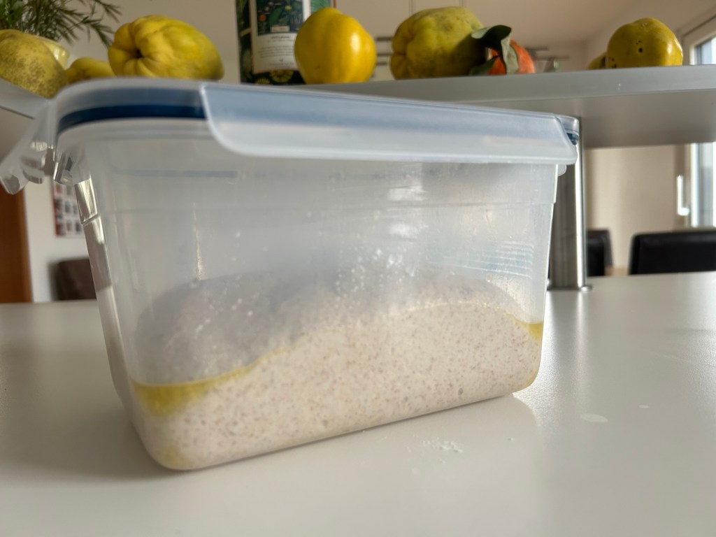 Für eine gleichmäßige Porung solltet ihr den Teig während der Stockgare mindestens 1–2 Mal dehnen und falten.