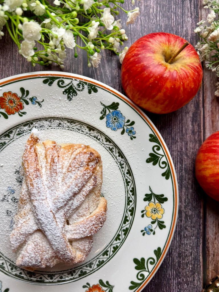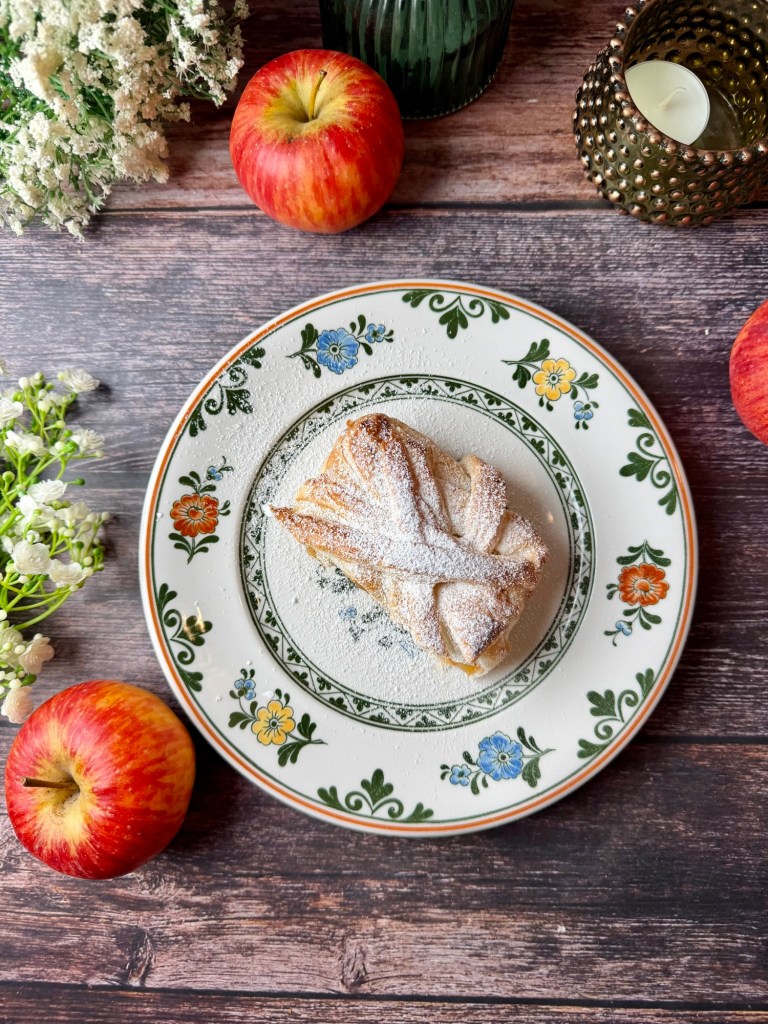 Apfelschlangerl ist die schnelle, österreichische Schwester vom Strudel: Blätterteig, mittig eine Apfelfülle, die Seitenstreifen abwechselnd darübergelegt – ein kleiner Zopf, der im Ofen knusprig aufblättert.