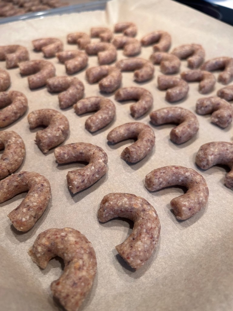 - Aus dem Teig kleine Kipferl formen und auf ein mit Backpapier ausgelegtes Backblech legen.