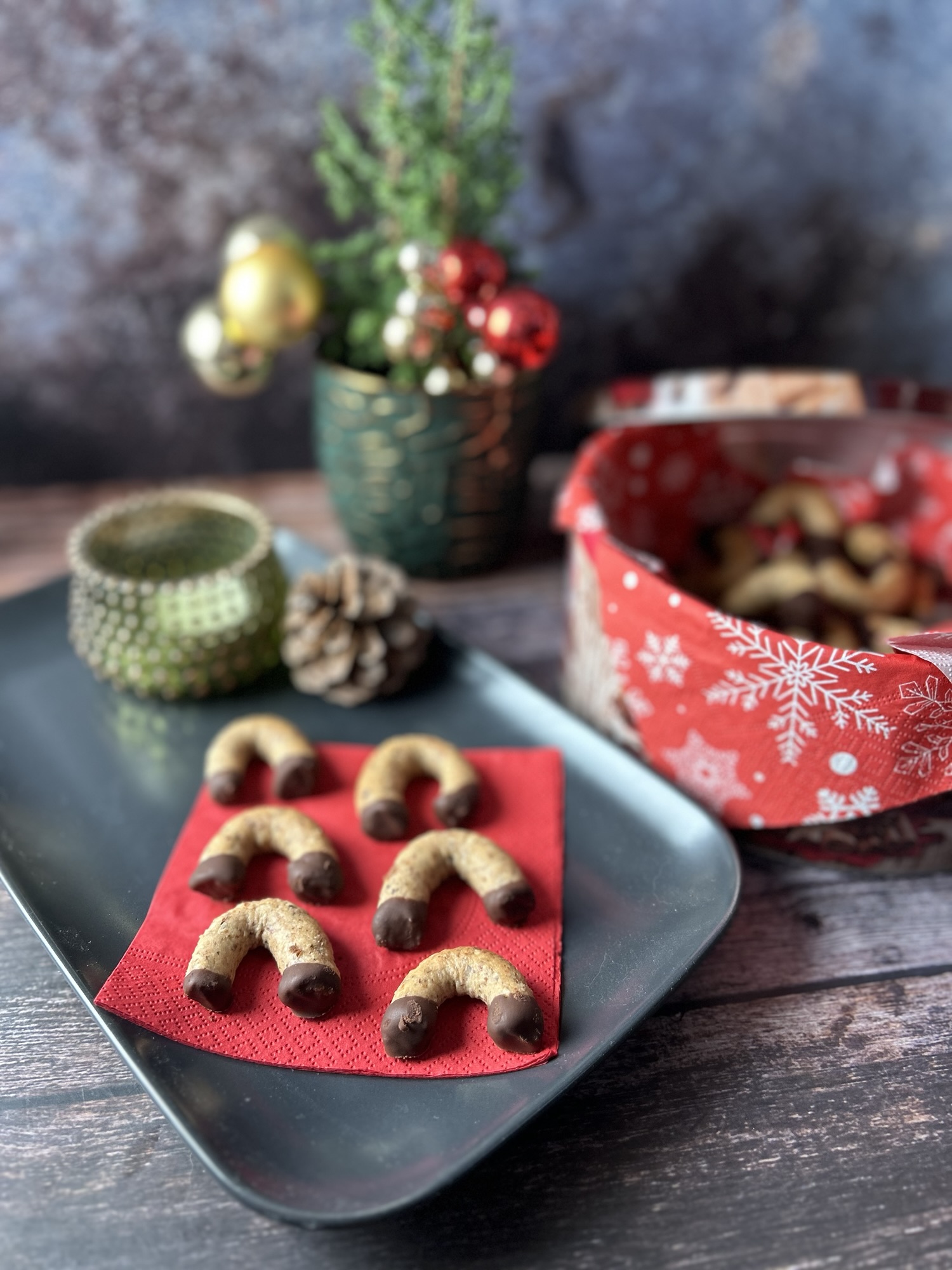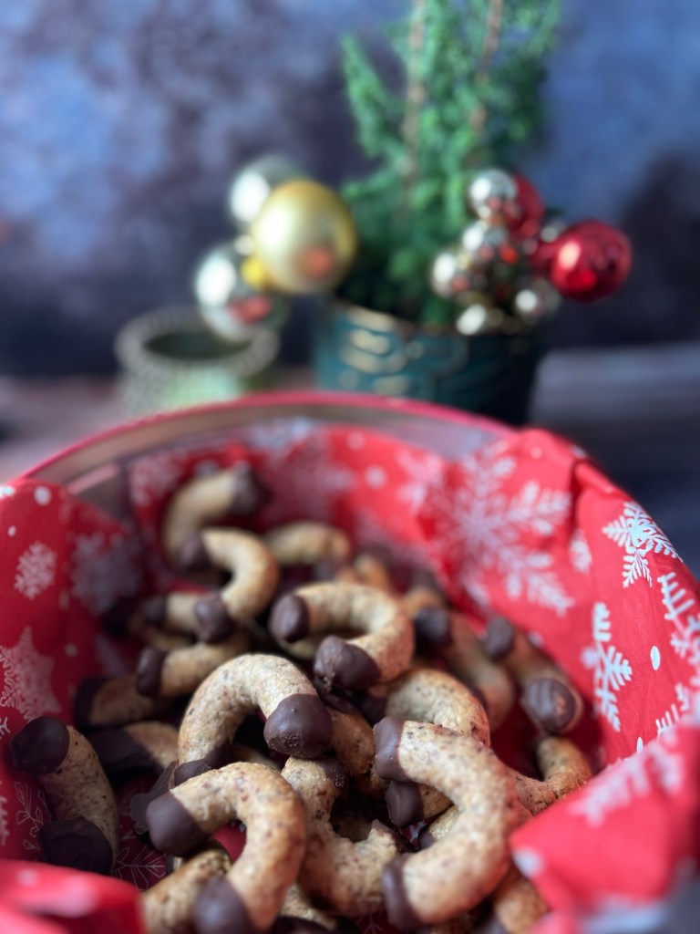 - Aus dem Ofen nehmen und vollständig auskühlen lassen. Die Enden der Kipferl in Schokoladeglasur tunken und trocknen lassen.