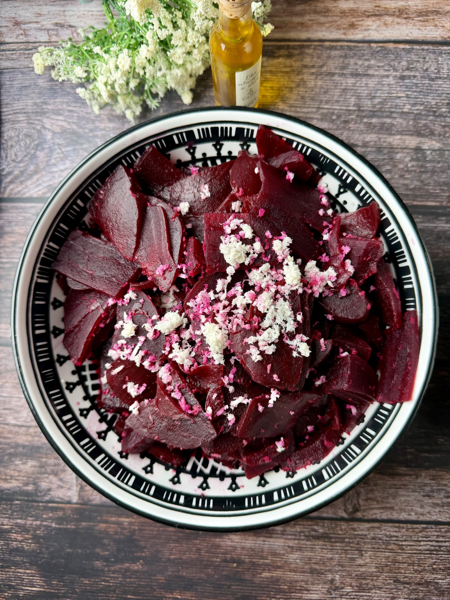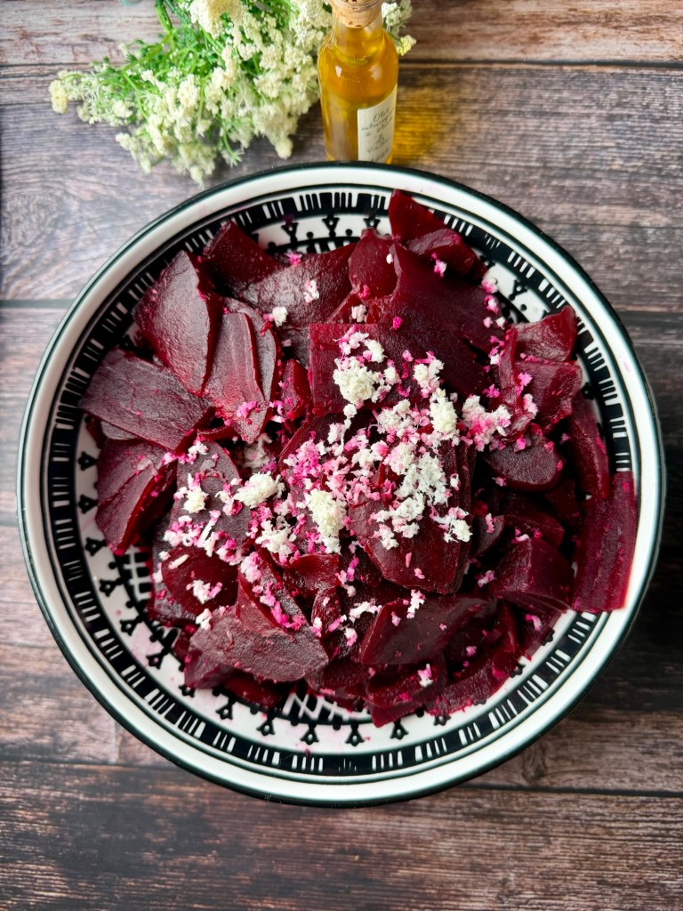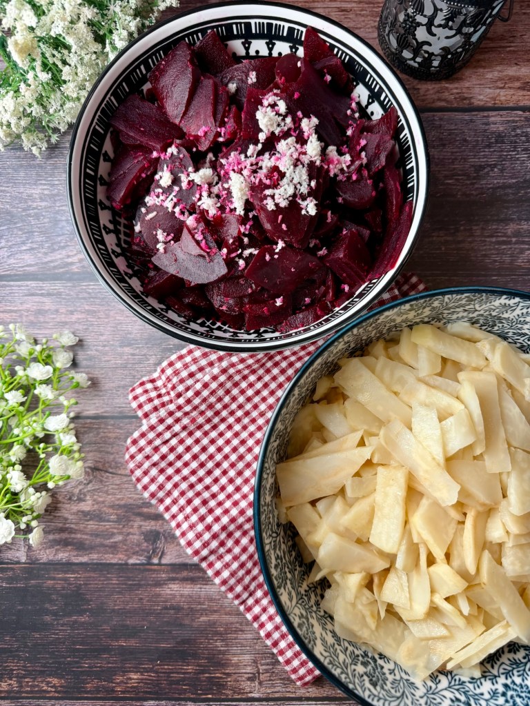 - Rote Bete weich kochen, abkühlen lassen, schälen und in feine Scheiben schneiden.