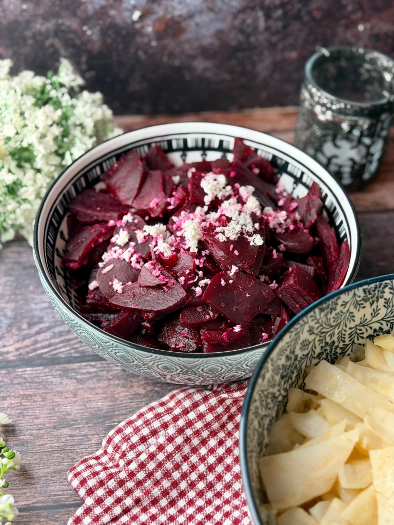Raunasalat (Rote-Rüben-Salat) ist ein fester Bestandteil der österreichischen Hausmannskost und bei uns traditionell bei jedem Weihnachtsessen oder Silvesterfeier dabei. Rote Rüben sind ein typisches Winter- und Lagergemüse und waren früher eine wichtige Vitaminquelle in der kalten Jahreszeit. Entsprechend einfach und funktional ist auch die Zubereitung.
