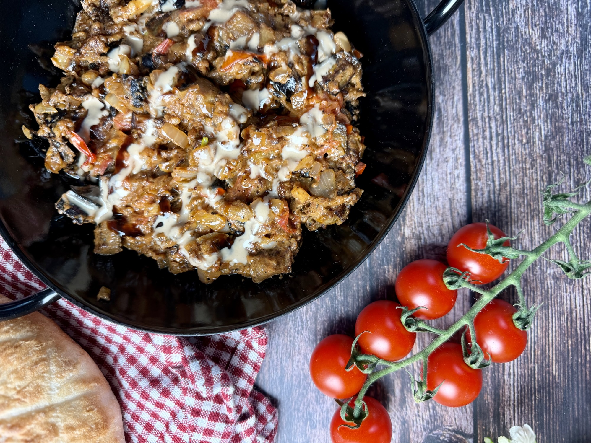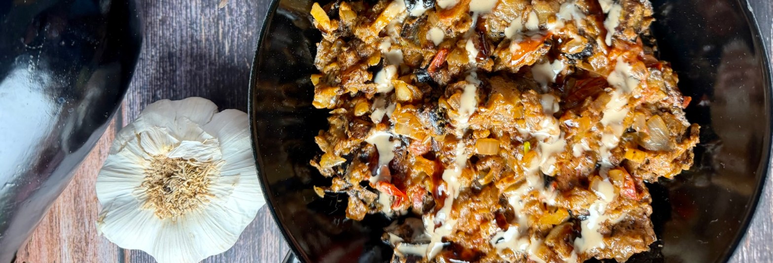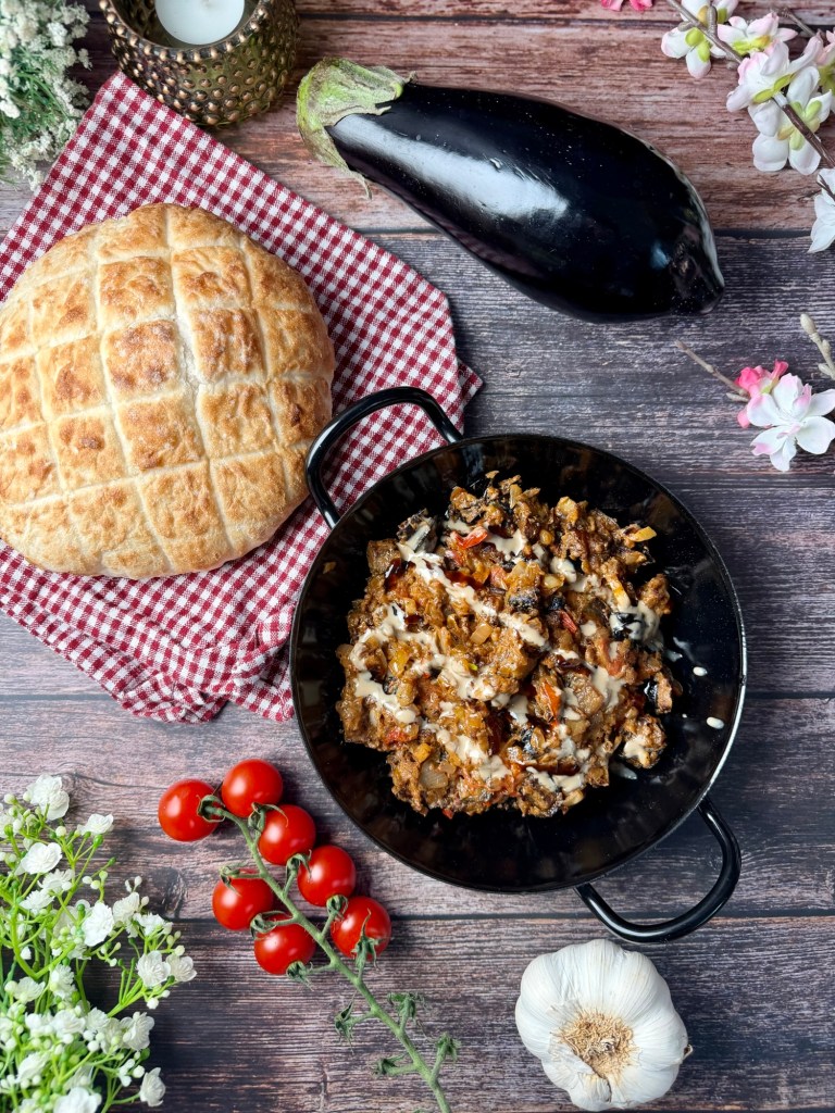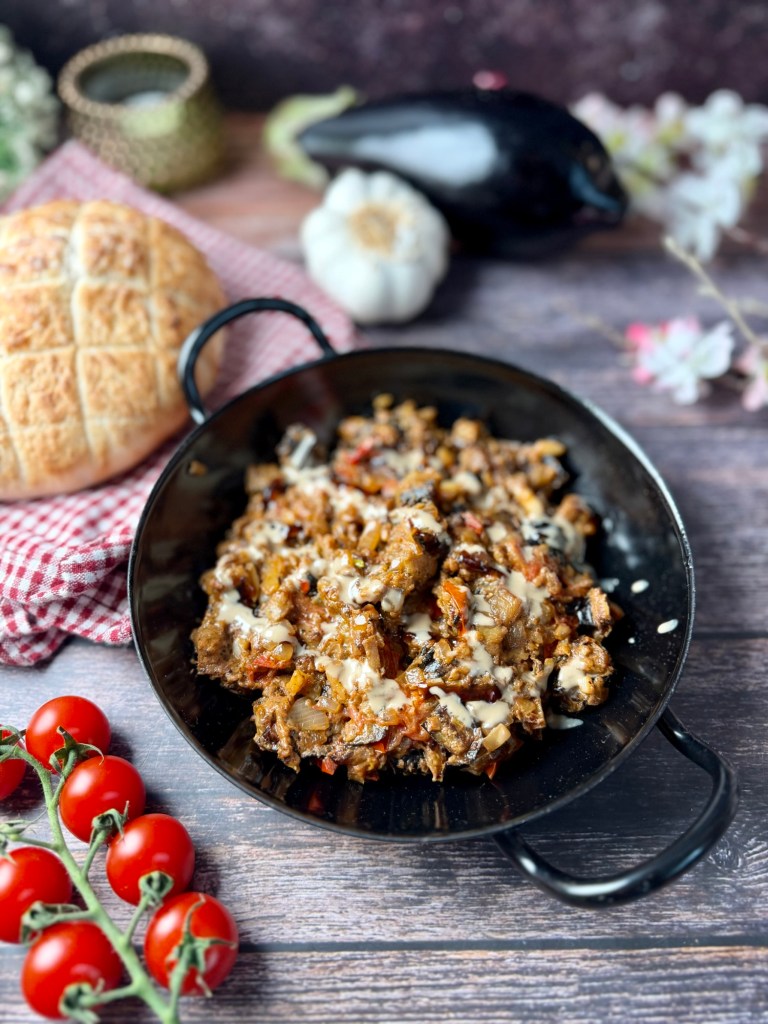 Die orientalische Auberginenpfanne mit Tahini ist ein aromatisches, vegetarisches Gericht mit typischen Zutaten aus der levantinischen Küche. Auberginen werden dabei langsam in Olivenöl gebraten, bis sie weich und leicht gebräunt sind – genau so entwickeln sie ihr volles, nussiges Aroma. In Kombination mit Tomaten, Zwiebeln und Knoblauch entsteht eine herzhafte Basis, die durch Gewürze wie Koriander und Chili eine warme Tiefe erhält.