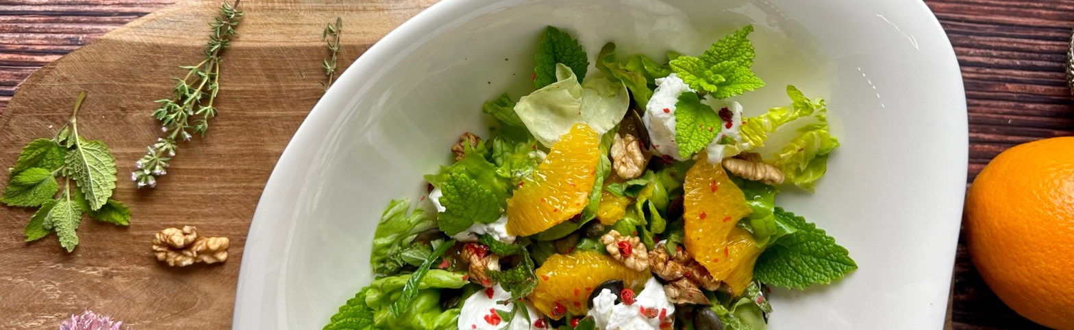 Salat mit Orangendressing, Nüssen und Orangenspalten