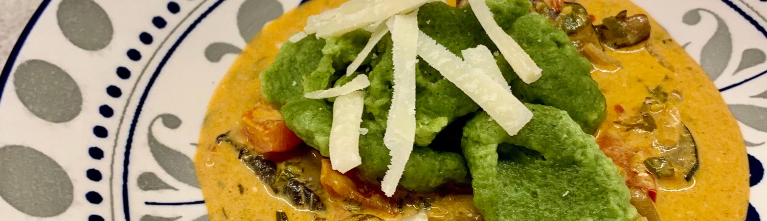 Spinatnockerl mit pikantem Gemüsegulasch