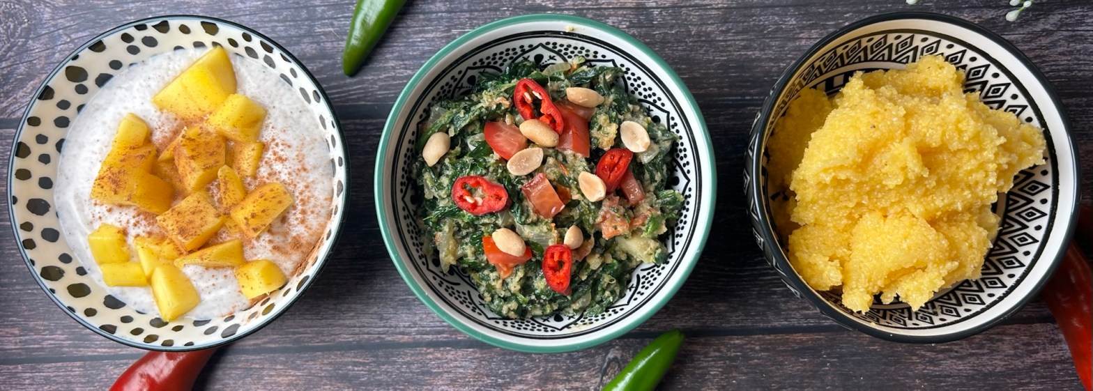 Afrikanischer Erdnuss-Spinat-Eintopf (Ifisashi) mit Maisbrei (Nshima)