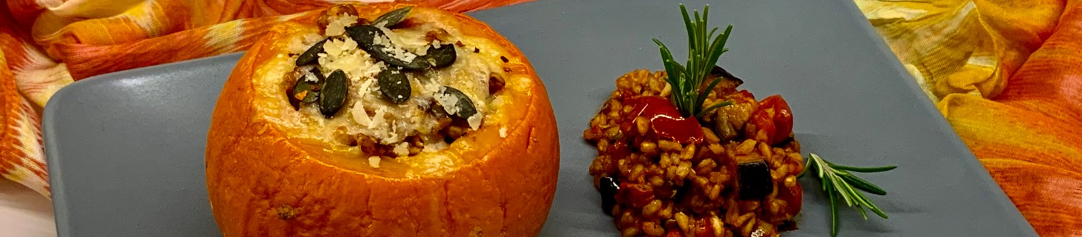 Mediterraner Hokkaido Kürbis mit Auberginen und Dinkel-Reis